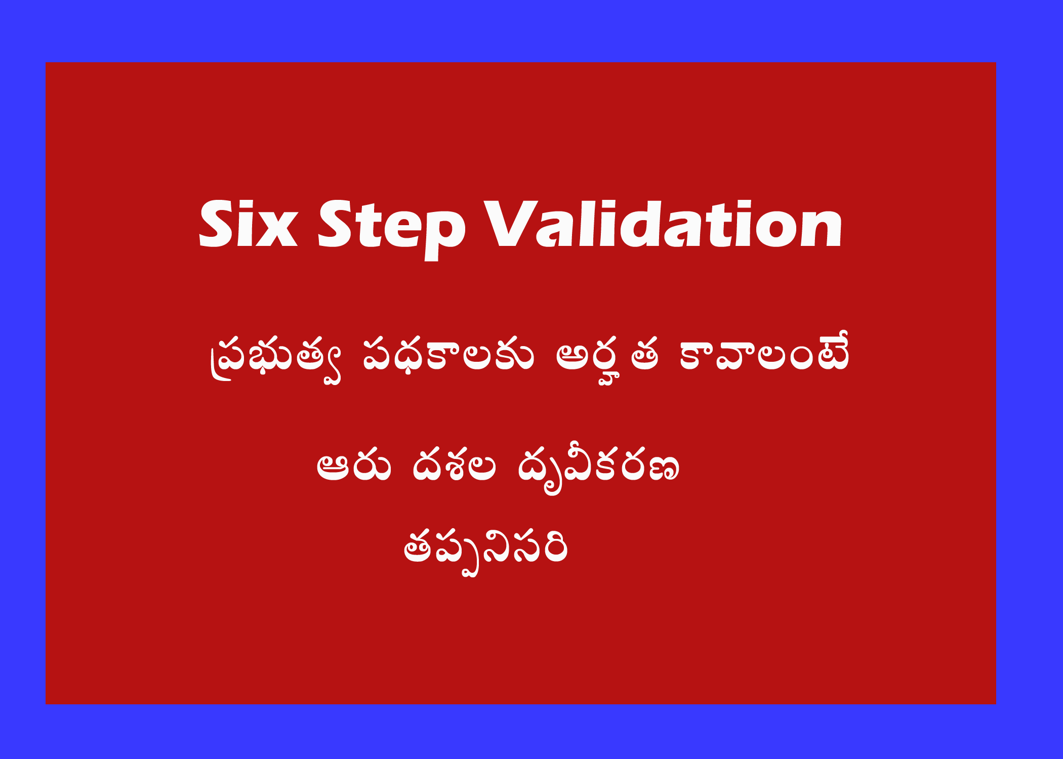 ఆంధ్ర ప్రదేశ్ ప్రభుత్వం ప్రతిస్థాత్మకంగా ఏర్పాటు చేసిన గ్రామ వార్డు సచివాలయ వ్యవస్తా ద్వారా ప్రజలకు గడప వద్దకే సేవలను డెలివరీ చేస్తున్నారు. ఇలా పధకాలను చేరువ వేయడం లో అర్హులను గుర్తించడానికి ప్రభుత్వం ఎంచుకున్న లేదా నిర్ణయించిన వ్యవస్తే ఆరు దశల దృవీకరణ . ఈ ఆరు దశల దృవీకరణ లో ప్రాధమికం గా వ్యక్తి వొయొక్క సమాచారాన్ని బట్టి వారు అర్హుల కదా అనేది నిర్న్యిస్తారు.